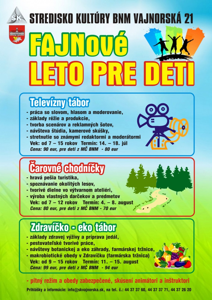 25.06.2014 - Pripravujete práve pre svoje dieťa prázdninový program? Máme pre vás výborný tip! Stredisko kultúry BNM na Vajnorskej ulici 21 organizuje v júli a v auguste denné tábory s názvom FAJNOVÉ LETO PRE DETI. Na výber je z troch tematických táborov:
