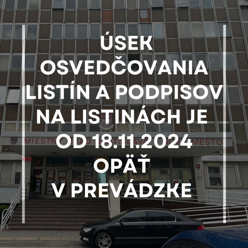 Miestny úrad Bratislava-Nové Mesto oznamuje občanom, že oddnes 18.11.2024 je úsek osvedčovania listín a podpisov na listinách opäť v PREVÁDZKE.
