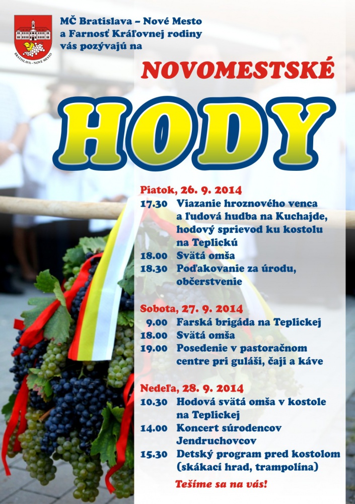 23.09.2014 - Mestská časť Bratislava – Nové Mesto a Farnosť Kráľovnej rodiny pozývajú Novomešťanov na NOVOMESTSKÉ HODY 2014.