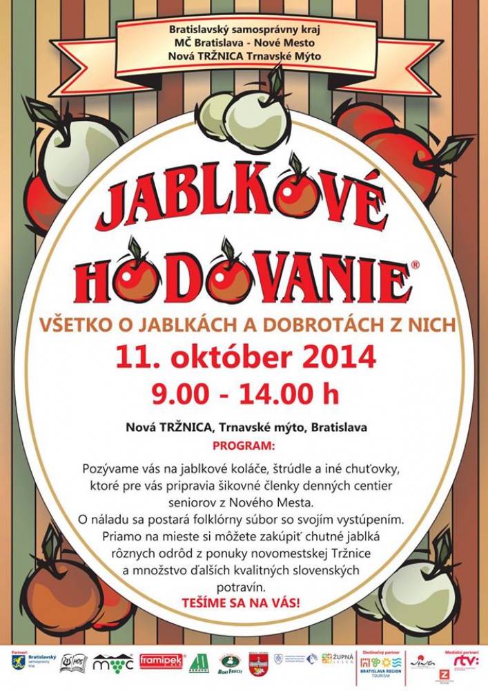 07.10.2014 - Máte radi jabĺčka a dobroty z nich? Mestská časť Bratislava - Nové Mesto v spolupráci s Bratislavským samosprávnym krajom pre vás pripravila JABLKOVÉ HODOVANIE. Uskutoční sa v sobotu 11. október 2014 od 9.00 do 14.00 h v Novej TRŽNICI na Trnavskom mýte.