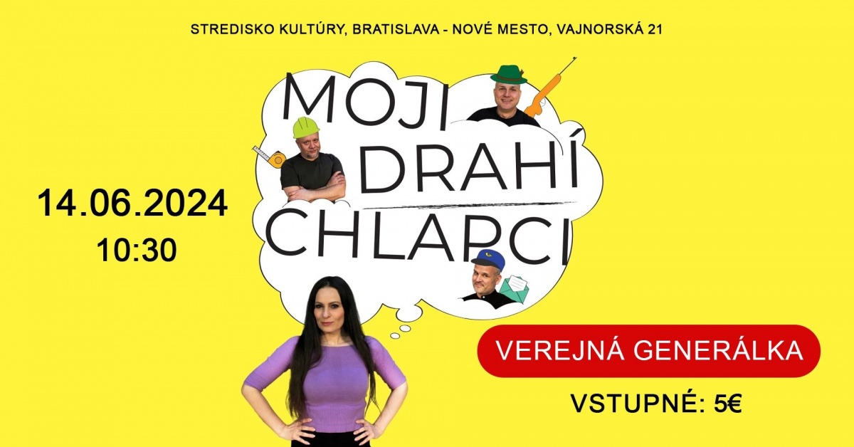 04.06.2024 - Stredisko kultúry Vajnorská 21 pozýva na verejnú generálku divadelného predstavenia Mojí drahí chlapci, ktorá sa uskutoční v piatok 14. júna 2024 o 10:30 hod..