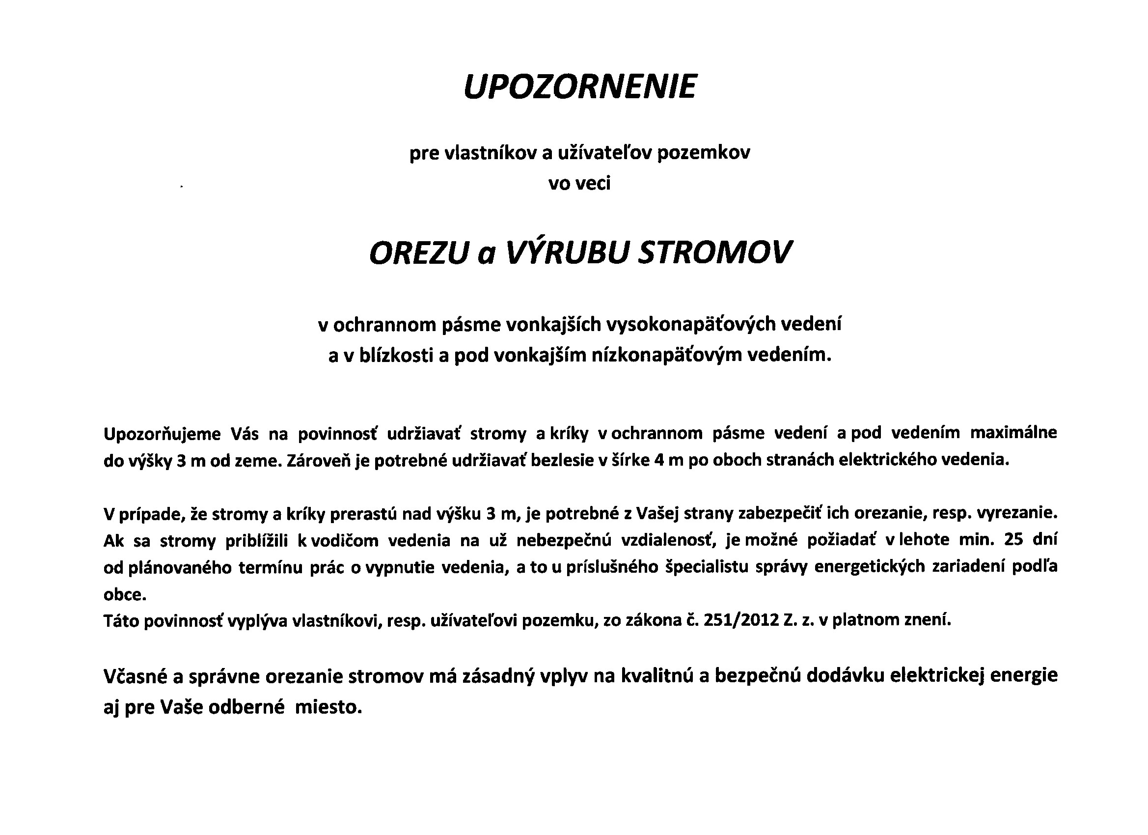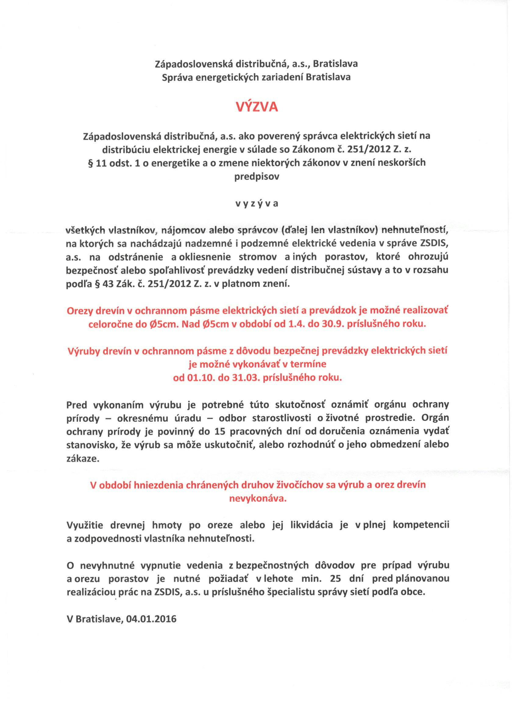 08.01.2016 - Západoslovenská distribučná, a.s., vyzýva všetkých vlastníkov, nájomcov alebo správcov nehnuteľností, na ktorých sa nachádzajú nadzemné i podzemné elektrické vedenie v správe ZSDIS, a.s., na odstránenie a okliesnenie stromov a iných porastov, ktoré ohrozujú bezpečnosť alebo spoľahlivosť prevádzky vedení distribučnej sústavy.